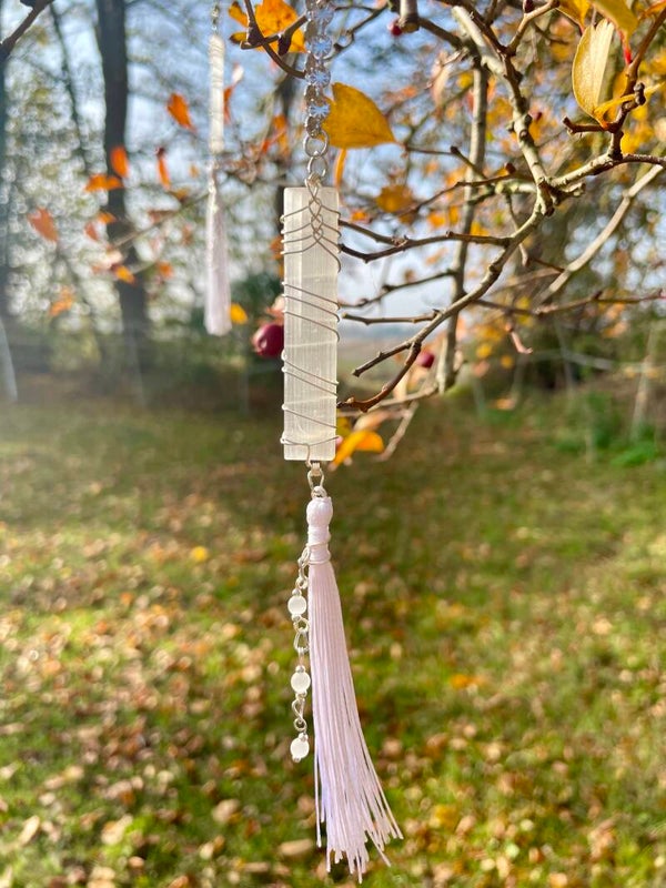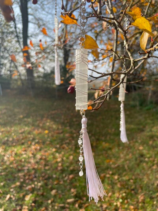 Jeder Anhänger ist ein UNIKAT, das mit viel Liebe zum Detail gefertigt wurde. Der wunderschöne Selenit-Anhänger, in seiner natürlichen Form, bringt nicht nur einen Hauch von Eleganz in dein Zuhause, sondern strahlt auch eine beruhigende Energie aus.
