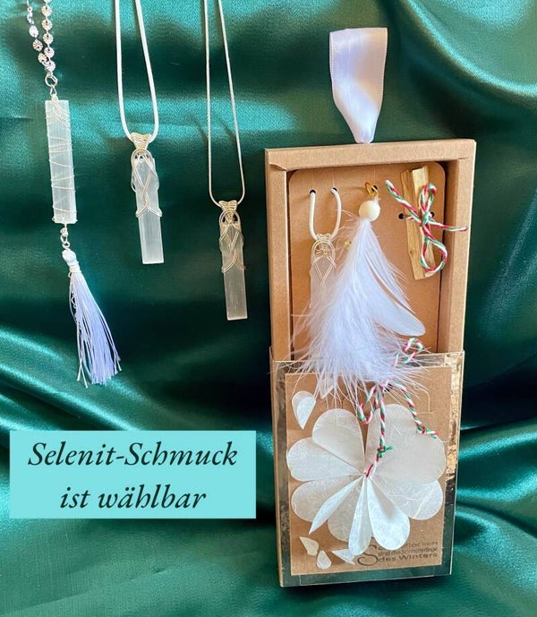 Dieses Set vereint einen zauberhaften handgemachten Engel, der Deinem Weihnachtsbaum mit seinem goldenen Heiligenschein und zarten Federn schmückt, sowie eine elegante Selenit-Halskette, die nicht nur als modisches Accessoire dient, sondern auch für ihre beruhigende Energie bekannt ist.