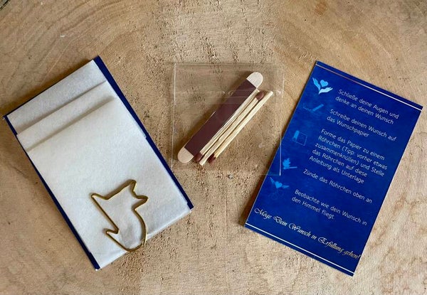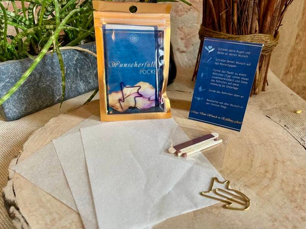 Die Pocket-Version des magischen Wunscherfüller-Sets ist perfekt für unterwegs oder kleine, spontane Zeremonien. Mit allem, was du brauchst, um deine Träume in den Himmel steigen zu lassen – kompakt, handlich und voller Magie.